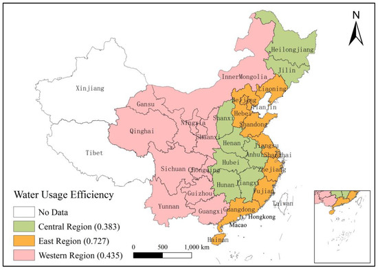 Figure 3 shows the average water usage efficiency by region; the eastern region has the higher efficiency with the value of (0.727). The central region shows less efficiency in water usage (0.383). However, the western region shows the middle range of efficiency. Overall, the regions are not efficient in water usage. It shows that China needs to reform and focus on strategies to improve water usage efficiency.