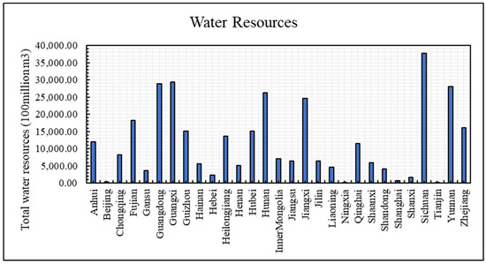 Figure 4 shows the total water resources of all provinces from 2006–2020. Sichuan has the highest total water resources (37,690.11). Subsequently, Guangxi has the highest total water resources (29,394.47). In comparison, Beijing, Ningxia, Shanghai, Tianjin and Shanxi have less water resources. Beijing is situated in the northern area of China, characterized by an arid and semi-arid climate. Rainfall levels in this region are comparatively lower than in other regions of China, notably in the southern areas.