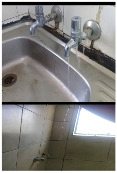 When a faulty system is not reported on time, there can be water loss which can run from days into weeks [34]. The attitude of some students also contributed to water loss in the institution. Some students sometimes leave the tap running while attending to other chores. A similar study by Bhagat [35] shows most water losses were due to several components of the distribution system including pipe-joint failure, relatively older pipes, the poor maintenance of water taps, pipe joints, and shower taps, the negligence of the consumer, and an unreliable water supply. Figure 4 shows the various places where water loss was observed in the current study.