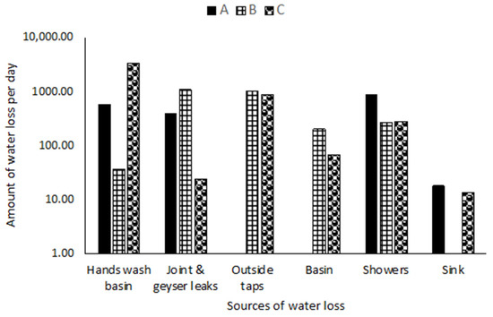 Some previous studies have reported on onsite water loss in various countries. In Colorado, DeOreo et al. [40] reported a 20% onsite water loss from the 16 households investigated. In other parts of the United States of America, Mayer et al. [41] reported that, of 1188 households studied, 67% of them recorded onsite water loss below 1.6 L/h while 5.5% of the households recorded 15.5 L/h. In Namibia, Fourie [42] reported an onsite leakage (20% and 9%) in two residential buildings with average leakage rates of 20.3 and 9.0 L/h, respectively. In South Africa, Mckenzie [10] and Alliance to Save Energy [9] reported onsite water loss due to leakage from various household faucets in the range of 20–38% in the Kagiso, Tembisa, Hernanus, and Mogale regions of South Africa. In Spain, the rate of onsite leakages up to 100 L/h was reported by Arregui et al. [43]. In Ethiopia, Bhagat et al. [35] reported a daily onsite water loss in the range of 0.01–1.77 L/h. In this study, onsite water leakage ranged between 76.89–109.22 L/h, which is higher than most of the cases reported. The various reasons given for the onsite water loss include: bursted pipe and joints; high water pressure; aged materials; corrosion of pipes; broken faucets; broken valves; damaged shower fixtures; unreliable pressure fluctuations; and the poor management of water fixtures, etc. [10,11,35,36,37,38,39,40].