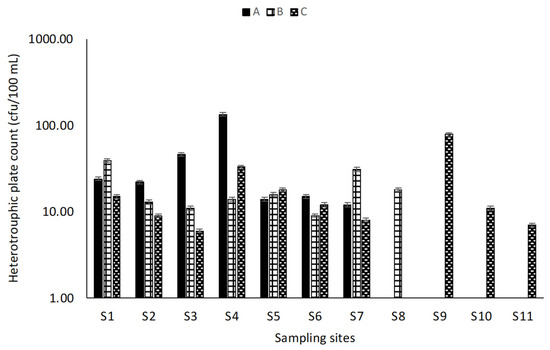 Trace metals were analyzed using an inductively coupled plasma optical atomic spectrophotometer (ICP-OES) (Agilent 5800, Agilent Technologies, Mulgrave, Victoria Australia). The National Institute of Standards and Technology traceable standards (NIST, Gaithersburg, MD, USA) were used to calibrate the instrument before sample analysis. Analytical precision was routinely verified by NIST-traceable quality control standards. Microbial analysis was done using the membrane filtration technique for estimation of faecal coliform and total heterotrophic bacteria (nutrient agar). Media were sterilized in the autoclave at 121 °C for 15 min. Sterilized media were dispensed in sterile petri dishes and allowed to cool. The pore size used for filtering was 0.2 microns for each water sample. Filter papers with a diameter of 47 mm were used, and the filter sheets were set on sterile agar surfaces. For 24 h, plates were incubated at 37 °C [19,20].