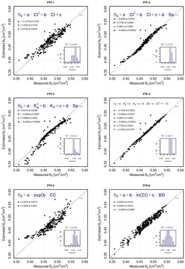 The most used statistic indicators to evaluate the goodness of fit of the PTFs are the root-mean-square error (RMSE), the mean error (ME) and the correlation coefficient (R) [,].