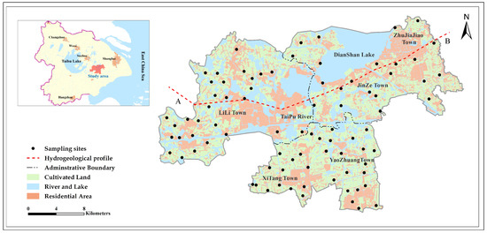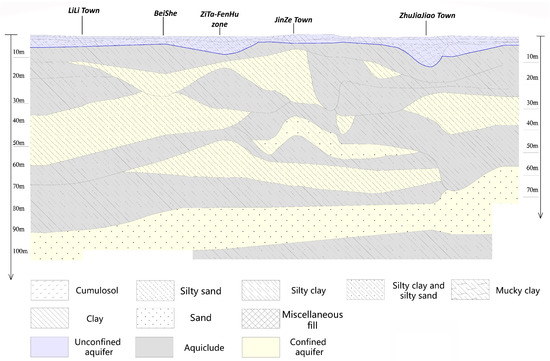 The pilot promoter region of the Yangtze River Delta integration demonstration zone (– N and – E) is located southeastern of the Taihu Lake with a total area of 653.9 km (Figure 1). It is under a subtropical monsoon climate, with 16.2 °C annual temperature and 1127.1 mm annual rainfall [42]. The groundwater in this region is mainly distributed in the sand and silt layers from Quaternary sediments [43,44]. The thickness of the Quaternary sediments is larger than 150 m according to the borehole materials, and the phreatic aquifer with thickness ranging from 3 to 7 m is the layer closely related to human activities (Figure 2). The aquifer is recharged from precipitation, river infiltration, and irrigation; in the meantime, its discharge mainly occurs through run off to rivers and evaporation since restrictions on groundwater exploitation have been imposed by the government since 1997 [45]. As an interactive area of Jiangsu, Zhejiang Provinces and Shanghai metropolis, this area is one of the most developed regions in China. Based on the a remote sensing survey with field validation, a major part of the land use in this area is cultivated land and residential area. Industries, especially textile factories, are mainly scattered in the south of the study area. What is more, a dense surface water network, including Taipu River and Dianshan Lake, is located in this area, which makes the surface water–groundwater interaction extremely complex. Hence, heavy agricultural activities and industrial sewage pose substantial threats to groundwater security. The application of nitrogen fertilizers and the use of industrial chemicals constitute potential point and non-point sources of groundwater contamination.