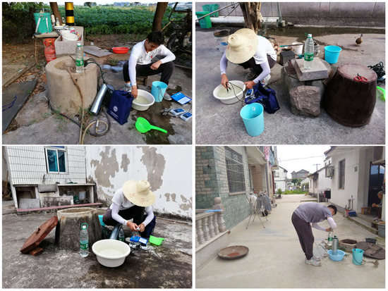 Groundwater samples were collected from 84 wells in June 2020 and June 2021, and the sampling sites were chosen with the considerations of land-use types (cultivated land, residential land, etc.) and spatial distribution (approximately 1 km per point) (Figure 1). In each well, the water temperature (WT), pH, dissolved oxygen (DO) and total dissolved solids (TDS) were measured by SX-620 pH Testor, SX-630 ORP Testor and Hanna DiST in situ, respectively. Figure 3 shows the landscape surroundings of several wells and the in situ test procedures. Polyethylene containers with a capacity of 1.5 L were used to store groundwater samples, and then brought back to the laboratory for an analysis of total phosphorus (TP), , , , , , , , , , , I and . Various instruments were used for the analyses (Table 1).