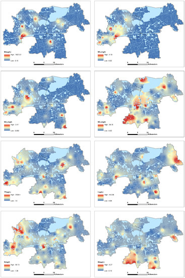 The variation coefficient of groundwater quality parameter is an index presenting the overall variability of the samples, and such variability is believed to be caused by various anthropogenic activities [51,55,56]. Here, the geographic information system technique with inverse distance weighted interpolation method was utilized to generate the spatial distribution of groundwater quality parameters with variation coefficient larger than (Figure 4). The comparison between figures showed that the contaminants could be classified into several groups with similar spatial distribution. For instance, , and were relatively enriched in the western corner of the study area, while higher concentration of and were detected in the centre and northwestern of the region. As for , it can be found distributed all across the region, but the highest concentrations are found primarily in the southern area, which was consistent with the location of textile industries.