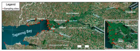 Due to relatively favorable climatic conditions, the regions of southern Russia are predominantly agricultural. Thus, the Rostov and Krasnodar regions together account for 11.6% of the value of agricultural production produced in Russia [1]. The developed agriculture provided the basis for the growth of industry in the cities, in particular the metallurgy, metalworking, and agricultural engineering industries. There is also an electrical and thermal power industry, the manufacture of chemicals and chemical products, the consumer industry, and food processing [2]. The most populated urban areas in the region are traditionally located along the rivers, the largest of which is the Don, and on the coast of the Sea of Azov. In the coastal cities of Taganrog, Azov, and Yeysk, as well as Rostov-on-Don, there are seaports, which are one of the main sources of pollution of surface water and bottom sediments. In recent decades, the trends in the development of coastal areas for tourism and recreation have become more important [2,3]. It is the landscapes of the Lower Don and the coast of Taganrog Bay that are experiencing the most significant anthropogenic pressure, the main adverse consequences of which are the degradation of soil and vegetation cover, including those occurring as a result of chemical pollution [3,4,5,6].