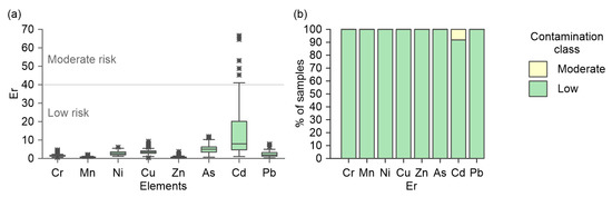 The ecological risks of PTEs were assessed using individual and integral risk indices. The potential ecological risk factor (Er) and the potential ecological risk index (RI) are widely used to assess the risk of PTE soil contamination in wetlands and floodplains [9,46,47,51,52,53,54,55]. These parameters were calculated as follows: