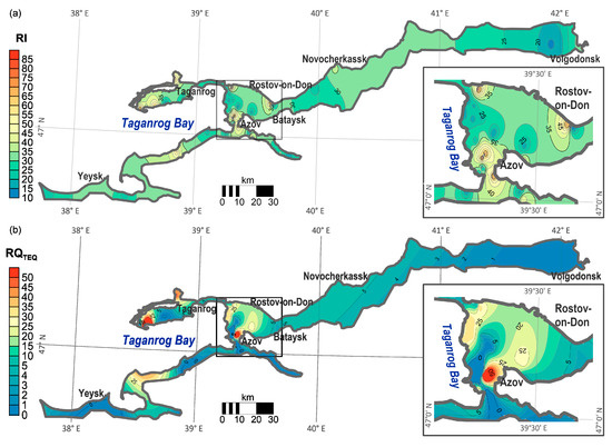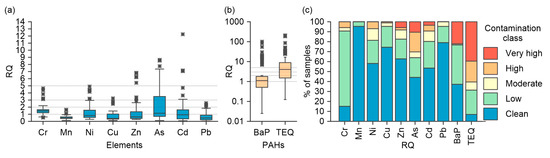 Two approaches were used to evaluate the ecological risk of soil contamination by different classes of pollutants. The first approach was to calculate individual and cumulative ecological risk parameters on the basis of the pollution index (PI), taking into account the toxic response factor of individual pollutants (Tr) [46,47,48,49]. Since Tr has not been established for individual PAHs, in this study, ecological risk parameters were calculated only for PTEs. The second approach was to determine the toxic pollution hazard on the basis of the risk quotient (RQ), which reflects the excess of PTEs and PAHs in soils compared with the established screening level estimate [11,50].