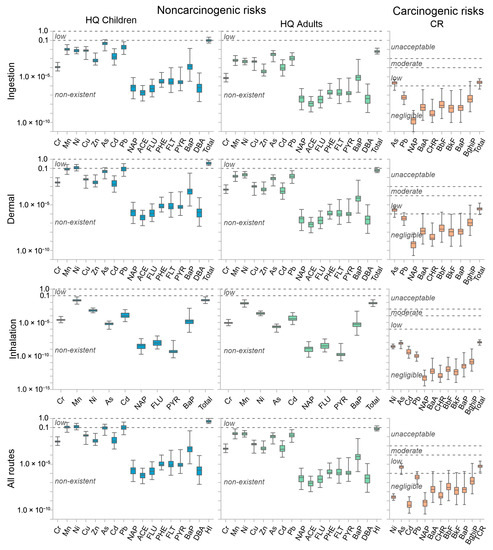 Subscripts indicate the entry paths of elements: ing—ingestion, derm—dermal contact, inh—inhalation. a where ABSgi is a fraction of contaminant absorbed in gastrointestinal tract: Cr 0.013, Mn 0.06, Ni 0.04, Cu 0.57, Zn, and Pb 0.1, As 0.95, Cd 0.025, and PAHs 0.89 [70]. b where RfC is a reference concentration [59]. c where ABSgi is a fraction of contaminant absorbed in gastrointestinal tract [70]. d where UR is a risk per unit content of the substance [59].