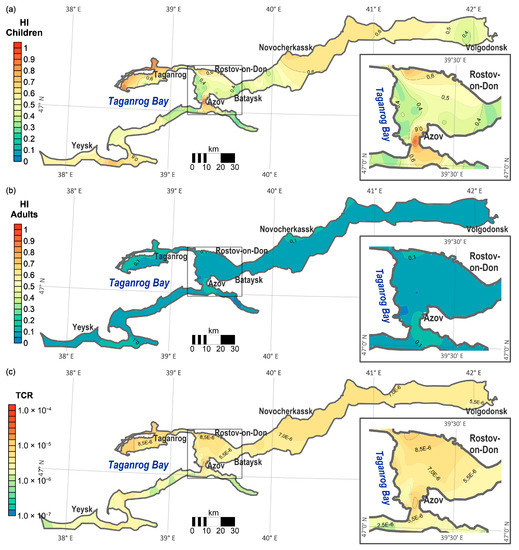 According to the values of HQ and HI [62], the following hazard classes are defined: non-existent (<0.1), low (0.1–1.0), moderate (1.0–10), and high (>10). The individual and total carcinogenic risks (CR and TCR values) are classified as follows [59,63,64]: negligible (<1 × 10−6), low (1 × 10−6–1 × 10−4), moderate (1 × 10−4–1 × 10−3), and unacceptable (>1 × 10−3).