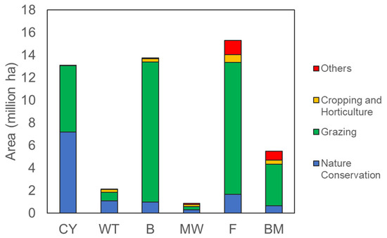 Total area and land use of NRM regions within the GBR catchments (CY = Cape York, WT = Wet Tropics, B = Burdekin, MW = Mackay Whitsunday, F = Fitzroy and BM = Burnett Mary).