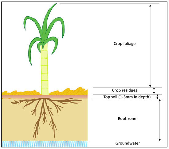 The following sections discuss potential major factors that affect herbicide fate and transport within the GBR catchments at crop foliage, crop residues, topsoil, and root zone. These factors are derived from studies directly related to the GBR or studies with similar land uses which may be applicable to the GBR. Figure 3 represents the areas in which herbicides may reside, interact, and be transferred after application, as well as identifying critical parameters for this study.