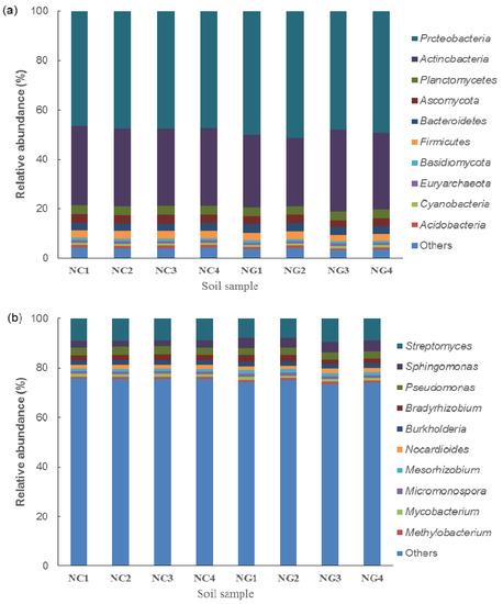 (a) The relative abundances of microorganisms at the phylum level in rhizosphere (NG) and non-rhizosphere (NC) soil and (b) the relative abundances of microorganisms at the genus level in rhizosphere (NG) and non-rhizosphere (NC) soil.