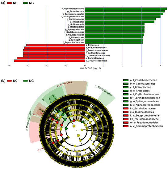 (a) Classification level discriminant analysis (LDA) of soil microbial communities by LEfSe analysis and (b) a cladogram of soil microbial communities by LEfSe analysis.