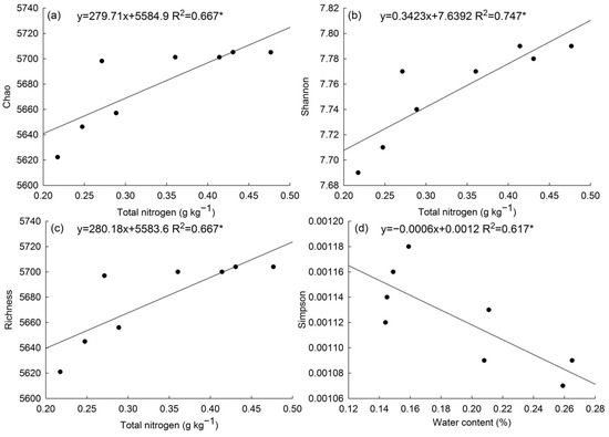 A simple linear regression analysis between soil water content, total nitrogen, and α-diversity indexes. Note: * indicated the linear regression was significant (p < 0.05), indicators for which regressions were not significant were not shown.