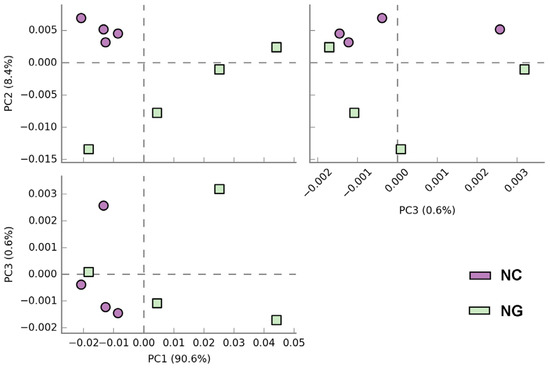To further clarify the differences in community species composition between the two types of soil, PCoA analysis was used to determine the similarity of microbial species composition in rhizosphere and non-rhizosphere soils. The results in Figure 4 showed that principal coordinates (PC) 1, 2, and 3 had an overall explanation of 99.6%, with PC1 contributing 90.6%, indicating that the differences in microorganisms between rhizosphere and non-rhizosphere soil were mainly associated with the first principal coordinates. The PCoA plot showed that samples from non-rhizosphere soils tend to be closely clustered, indicating relatively similar community composition, whereas rhizosphere soil samples showed a more scattered distribution, indicating a degree of variation. The rhizosphere group (NG) and non-rhizosphere group (NC) had a large difference in distribution distance, indicating that there were large differences in microbial community composition between the two types of soil of Poa alpigena L.