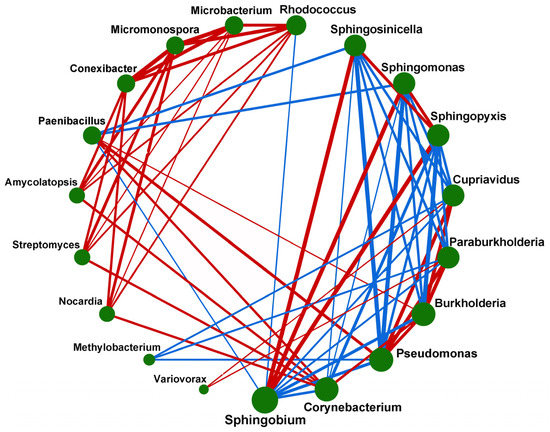 To examine the interrelationships among different microorganisms, the correlation analysis of microorganisms at the genus level was carried out in this study (Figure 6). The red and blue connecting lines, respectively, indicated the facilitatory and inhibitory relationships between the two connected genera, and the thickness of the lines indicated the absolute value of the correlation coefficient. The more the genera were related, the larger the green circle was. As shown in Figure 6, Sphingobium, Corynebacterium, and Pseudomonas had the most related genera, whereas Nocardia, Methylobacterium, and Variovorax had the fewest related genera. There were mutual facilitatory relationships between Burkholderia and Paraburkholderia, Burkholderia and Cupriavidus, and Cupriavidus and Variovorax. There were mutual inhibitory relationships between Burkholderia and Sphingopyxis, Pseudomonas and Sphingomonas, and Pseudomonas and Sphingosinicella. The facilitatory and inhibitory relationships between the different microorganisms indicated that different microorganisms interacted closely with each other and jointly influenced the metabolic process in the soil. However, the mechanisms underlying these microbial interactions need to be further studied.