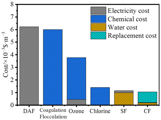 Operational costs mainly consist of electricity and chemical costs and the renewal costs of activated carbon. This controls the economy of the system and can be changed by adjusting the working conditions. To calculate the economic operational costs over a 5-year period using DAF at the PACl dosage of 14 mg·L−1, the power consumption of the equipment and the unit costs of the electricity and chemicals are listed in Table 1 and Table 2.