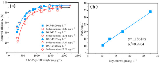 DAF and sedimentation have different treatment capabilities for the removal of algae cells. The performances of DAF and sedimentation to remove algae cells are shown in Figure 3a. DAF can achieve almost 95% removal efficiency, while sedimentation can only reach 90% under different PACl/dry cell weight concentrations. This is consistent with the literature [32,33]. Sedimentation depends on the aggregated algae particles sinking to the bottom to be removed. Therefore, it is difficult to separate light particles. However, DAF is achieved by introducing air bubbles. As the bubbles move upward, the formed floc-bubbles have a density lower than that of water; thus, they rise to the surface, making their removal easier [34]. Figure 3a indicates that when the PACl/dry cell weight reached 1200 mg·g−1, the efficiencies of the air floatation and sedimentation were at their highest. According to the four different algae concentration feeds, a correlation between PACl dosage and algae concentration under optimal operating conditions was obtained, which is shown in Figure 3b. Clearly, DAF can achieve higher treatment efficiency with less land use but has higher energy consumption. Therefore, the precise selection of DAF or sedimentation depends on subsequent processes such as sand filtration.