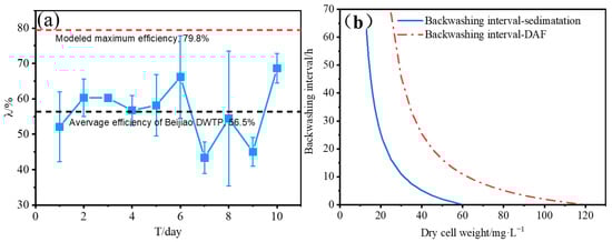 Backwashing constitutes the cost of sand filtration, which relies on the optimization of its frequency. DWTPs generally set a fixed backwash interval to reduce the labor costs of management. However, it easily clogs the sand filter and exceeds the limit of water head loss when the algae concentration is too high. Under the condition of low algae concentrations, this results in costly waste. According to Equations (2) and (3), the maximum efficiency of sand filtration for this DWTP can reach up to 79.8%. Sampling of the sand filter inlet and outlet water of the Beijiao DWTP for 10 consecutive days, the maximum and minimum sand filtration efficiencies were 74.4% and 40.2% (Figure 4a), respectively. The average sand filtration efficiency was 56.5% and the net water head loss of the sand filter was 0.7686 m (Equation (12)). According to the 95% efficiency of DAF and 90% efficiency of sedimentation, the relationship between the backwash interval and feed concentration (c) under the effluent water concentration of 1.2 mg·L−1 is shown in Figure 4b.