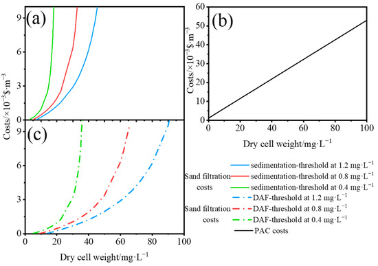The operational costs of the entire DWTP system depend on the algae concentrations in the raw water and the tolerances after sand filtration. The increase in operating costs is mainly caused by sand filtration under different effluent standards. The higher effluent threshold of sand filtration indicates that sedimentation will also meet the effluent standard of the sand filter, even if the algae concentration in the raw water increases. In Figure 5a, when sedimentation was used, sand filtration was increased with the increase of the algae concentration in raw water. The high effluent threshold of the sand filtration resulted in high sand filtration costs; this was due to the increase in backwash frequency. However, Figure 5c shows that DAF can be used before sand filtration under the same algae concentrations in raw water. The cost of sand filtration when using DAF before sand filtration is significantly lower than that when using sedimentation, because of the lower backwash frequency. Both sedimentation and DAF require PACl pre-treatment and the cost of PACl increases with increases in algae concentrations, as shown in Figure 5b; their dosages show a positive linear correlation with algae concentrations, as described above.
