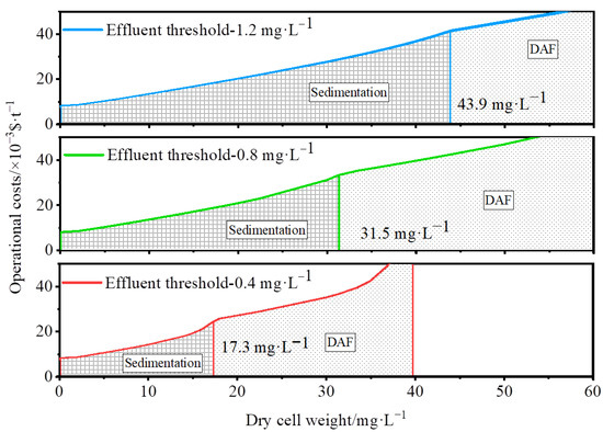 The relationship between effective operational costs and algae concentrations in raw water under different effluent thresholds is shown in Figure 6. The total operating cost was increased with increases in the algae concentration in raw water and decreases in the sand filter effluent threshold; this is because higher algae concentrations resulted in higher PACl usage and faster sand filtration backwash frequencies. This difference was not significant when the concentration of raw water was less than 10 mg·L−1. The cost of sedimentation was only from the PACl; however, DAF not only consumes PACl, but also needs a lot of operating electricity. Therefore, the Beijiao DWTP can save USD 250,539.5 per year by substituting sedimentation with DAF, while guaranteeing treatment capacity and safety. If the concentration of algae in the raw water is high, the DAF process must replace sedimentation, because the cost of sand filtration backwashing is higher than the electricity cost of DAF. The use of DAF instead of sedimentation is not only related to the raw water algae concentrations, but also to the effluent thresholds, as shown in Figure 6. The higher sand filter effluent thresholds result in higher algae concentrations in raw water when sedimentation is switched to DAF. DAF replaced sedimentation at the feed algae concentrations of 43.9 mg·L−1, 31.5 mg·L−1, and 17.3 mg·L−1, when effluent thresholds were 1.2 mg·L−1, 0.8 mg·L−1, and 0.4 mg·L−1, respectively. It is cost-effective to precisely control the usage of DAF or sedimentation, coagulation dosages, and the backwash intervals of sand filters based on algae concentrations in raw water and effluent thresholds.