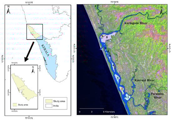 All of these findings imply that location specific research is needed to forecast the amount of ecological and geomorphologic changes that is happening in these ecosystems [11]. Recent innovations in data analytics, advancement in technologies, and theories in the area of remote sensing (RS) and geospatial information technologies have provided researchers with numerous opportunities to enrich their studies on the coastal environment [12,13,14]. Remote sensing (RS) is the process of proximal detecting and monitoring the characteristics of an object/area based on the data acquisition from satellite or airborne images, and GIS is a software tool for mapping and analyzing data, which will assist in proper interpretation [15,16,17]. Integration of these advanced techniques such as the Geographical Information System (GIS) and Remote Sensing (RS) proved to be an exceptionally useful method for assessing the physical changes in landform, because it is simple to have wide coverage with synoptic and recurring data (database from multispectral sensors with high resolution at spatial and temporal scales) and, most importantly, at a lower cost than other conventional methodologies [4,18,19]. The UN SDGs advocate the need for natural resources to be sustained to prevent further deterioration and degradation of these coastal ecosystems. In the face of deteriorating environmental conditions, regular monitoring, comprehensive investigation, and assessment of changes in natural resources become imperative. By keeping all these points in mind, in the present study, we attempted to understand the morphological changes in the shoreline and these coastal islands, to foster a comprehensive and systematic approach to conserve the resource from further degradation in the Kavvayi wetland.