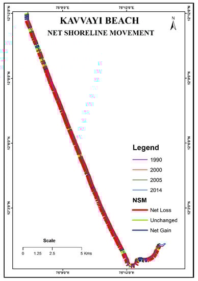 Net Shoreline Movement (NSM) of Kavvayi beach throughout the period of study from 1990 to 2014.
