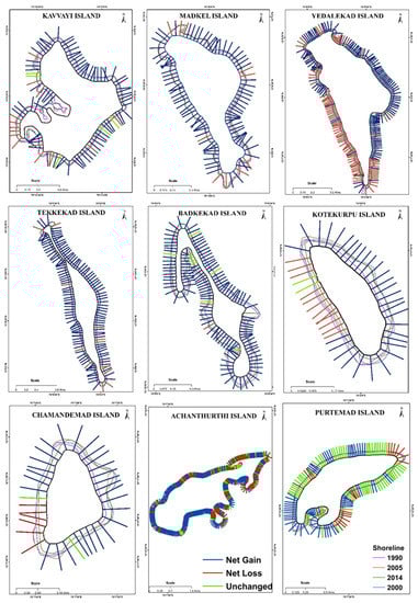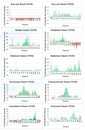 Net Shoreline Movement is the distance between the oldest (1990) shoreline and the most recent (2014) along each transect generated for the study area. The results of NSM rates are given in Table 1 and Figure 2, Figure 3 and Figure 4. Upon analyzing NSM rates from nine islands and one beach, it can be shown that Kavvayi beach and Achanthurti Island were subjected to erosional processes from 1990 to 2000. Compared to the NSM values for 2005–2014, erosional activity in 1990–2000 was less as the minimum NSM values during 1990–2000 were −53.190 at minimum and 114.240 at maximum, with a mean value of −7.742. The NSM values during 2000 to 2005 were −158.950 at minimum and 65.580 at maximum, with a mean of 9.125.