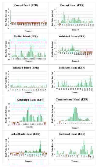 Bar graphs representing End Point Rate (EPR) of Kavvayi beach, Kavvayi island, Madkel island, Yedalekad island, Tekkekad island, and Badkekad islands of Kotekurupu island, Chamandemad island, Achanthurti island, and Purtemad island of Kavvayi wetland.