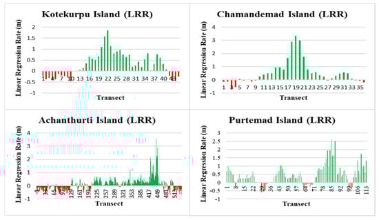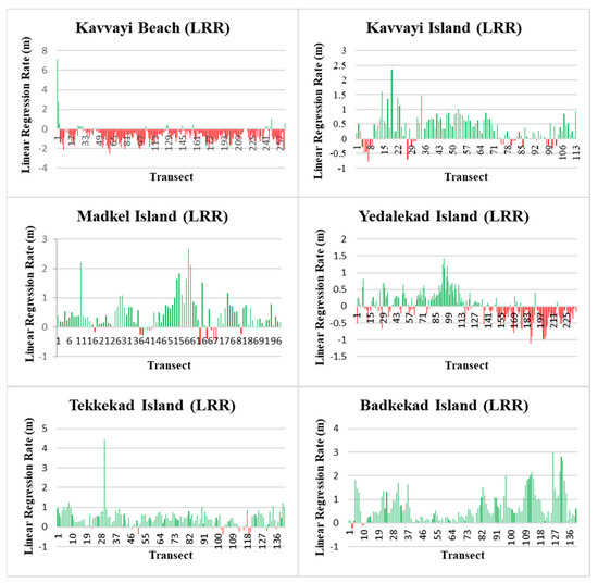 LRR is used for calculating change rates of shorelines, which consists of fitting a least-squares regression line to multiple shoreline positions for particular transects (Nassaar et al., 2018). A detailed analysis of the linear regression rate (LRR) and the average shoreline change rates for the selected islands is given in Table 1. Kavvayi beach LRR values showed an LRR of −0.719, showing that the erosion was high in the period of study. All the islands in the study area showed positive values, implicating depositional activity occurring. Out of nine islands in the study area, Yedalekad showed the highest erosion rate, which was −1.120, and the maximum value of LRR was 1.430, with an observed mean value of 0.008, which was the least value identified for all the islands. This was supported by high erosional rates on Yedelakkad Island in the period of 2000–2014. On the other hand, Badkekad Island and Chamandemad Islands showed mean values of around 0.654 and 0.543, respectively, and were the islands with high depositional rates according to LRR (Figure 6).