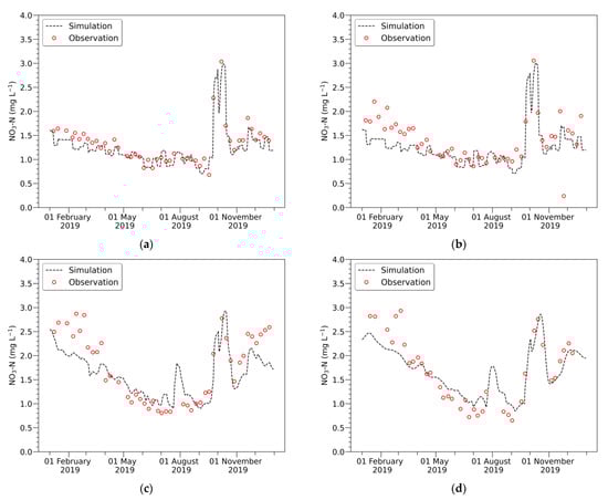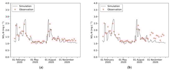 We assessed the model performance for NO3-N dynamics by adopting both the objective criteria established by Moriasi et al. [69] and the graphical method. According to Moriasi et al., model performance for nitrogen (N) is “Good” if 0.60 < R2 ≤ 0.70, 0.50 < NSE ≤ 0.65, and ±15% ≤ PBIAS < ±20%, while it is “Satisfactory” if 0.30 < R2 ≤ 0.60, 0.35 < NSE ≤ 0.50, and ±20% ≤ PBIAS < ±30% at the watershed scale. The gap between the watershed-scale model and our river model was closed by simultaneously employing the graphical method in the same way as when the model performance for flow simulation was assessed.