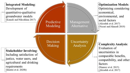 The remainder of this study is structured as follows. Section 2 provides an overview of the predictive modeling for groundwater management and allocation. Section 3 presents the management alternatives related to groundwater resources. Section 4 discusses the uncertainty analysis to manage groundwater resources suitably, followed by Section 5, defining the decision-making procedures within the groundwater modeling systems. Finally, concluding remarks and suggestions for future studies are noted in Section 6 and Section 7.