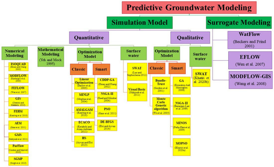 The quantitative groundwater models’ objectives can be achieved effectively by exploring the quantitative analysis from three main points of view: (1) Mathematical and numerical modeling, (2) Optimization model, and (3) Surface water parameters (Table S1, Supplementary Materials).