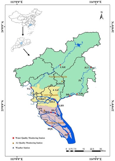 Guangzhou (22°26′–23°56′ N, 112°57′–114°03′ E), the capital of Guangdong Province, is located in southern China and the north-central Pearl River Delta. Guangzhou is characterized by a typical south subtropical marine climate, with an annual average temperature of 22.5 °C. The mean annual rainfall is nearly 1720 mm, 80% of which occurs in the wet season from April to September. Most rivers in Guangzhou belong to the Pearl River system, with mountain rivers in the northeast, and a river network formed by Guangzhou reach of the Pearl River and its tributaries in the south. Based on the hydrological characteristics and geographical conditions, the Guangzhou river system can be divided into three major river basins, including the northern, central and southern basin. To monitor the changes in river water quality, 11 national automatic stations were built in Guangzhou to collect water samples for quantitative real-time analysis. More information about these stations for monitoring surface water quality is shown in Figure 1.