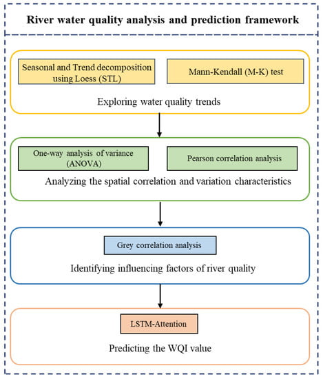 In the present study, a novel spatiotemporal analysis and prediction framework was proposed based on nonparametric statistical methods and a deep learning algorithm for an accurate and reliable assessment of water quality (Figure 2). The STL and MK methods were used to characterize temporal variation of river water quality and identify water quality tendency. The ANOVA and Pearson correlation analysis methods were employed for the analysis of spatial correlation and variation characteristics. The grey correlation analysis was applied to assess the factors influencing water quality at different basins. Finally, the ensemble of an LSTM-attention model was introduced to predict water quality.