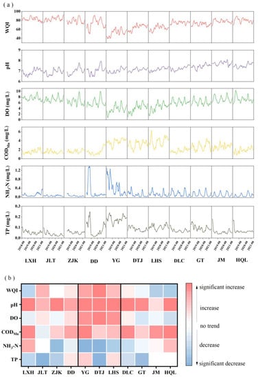 (a): Long-term trend for river water quality in Guangzhou reach of the Pearl River from 2018 to 2021; (b): Mann–Kendall test results for water quality parameters at each sampling site.