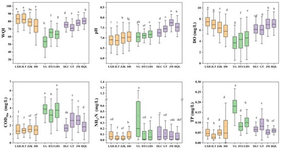 According to the analysis results of one-way ANOVA (Figure 4), a significant difference in water quality among the three river basins in Guangzhou was observed. Notably, the WQI values at the central basin (i.e., YG, DTJ, LHS) (with an average value of 60.03) were significantly lower than those of the northern basin (LXH, JLT, ZJK, DD) (with an average value of 79.60) and those of the southern basin (DLC, GT, JM, HQL) (with an average value of 76.28). The variation in WQI values among the monitoring stations were consistent with individual water quality parameters, suggesting that the highest concentrations of CODMn, NH3-N and TP were observed, while the lowest levels of DO were found at the central basin in the present study.