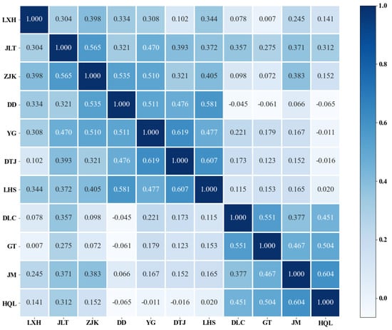In addition, the direction of river flow may exert significant spatial influence on water quality []. In general, the water quality at upper/lower stations of the same stream exhibits similar variation patterns. To assess the degree of spatial dependence in water quality, Pearson’s correlation coefficient (R) was employed to analyze the correlation of WQI among 11 stations. Our findings indicated that there were moderately positive spatial correlations among monitoring stations in the same basin, with Pearson’s R value ranging from 0.304 to 0.619 (Figure 5). This finding suggested that stations adjacent to each other exhibited similar WQI values, presumably due to their similar anthropogenic pressures, landscape usage and topography []. By contrast, weak spatial autocorrelations were observed among monitoring stations at different river basins, with Pearson’s R values ranging from −0.065 to 0.581. This finding might have been associated with landscape variability, local river management and the relative location of monitoring stations in rivers []. The presence of spatial autocorrelation was regarded as a possible diffusion process, suggesting that water quality in an upstream station could be used to predict water quality at a downstream station []. Therefore, in order to better understand the variations in water quality when establishing a predictive model, the spatial correlation among the sampling sites should be fully considered.