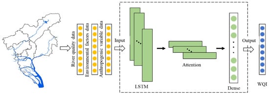 LSTM, a deep learning algorithm dedicated to sequential data was used for water quality prediction, consisting of a group of circularly connected memory cells for storing and transmitting sequence information. The structure and forward pass of the LSTM model is described in Text S1 of the Supplementary Materials. The attention mechanism enables a neural network to focus on the most important parts of input data, which can further improve performance of LSTM in dealing with long term input data []. As such, the attention mechanism based on LSTM was implemented to accurately predict river water quality.