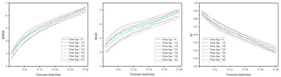In order to avoid redundancy, water quality prediction at DD station was further explored for LSTM-attention evaluation. In particular, the influence of time lag on the model performance was analyzed for ensuring the prediction accuracy. Several time lag parameters (i.e., 6, 12, 18, 24, 30, 36, 42), ranging from 1 day to 7 days, were set up in the LSTM-attention model to predict the water quality from 4 h to 5 days in the future (i.e., forecast lead-time from T + 1 to T + 30, where T denoted the current moment). This finding indicated that the optimal time lag was determined to be 30, at which the model achieved the best prediction performance with the lowest values for RMSE and MAE as well as the highest R2 values (Figure 7). It is worth noting that under this optimal parameter setting, the prediction accuracy gradually decreased as the forecast lead-time increased. For instance, when the forecast lead-time increased from T + 1 to T + 30, the R2 value was reduced from 0.90 to 0.45. When the forecast lead-time was increased, the imperfect descriptions of input features and the internal uncertainty in LSTM-attention exerted influence on model training, resulting in a decrease in the prediction accuracy []. Alexander et al. [] investigated the suitable values of R2 as model fitting statistics and indicated that high R2 values over 0.6 could ensure the model fitting the data well, demonstrating the robustness of our LSTM-attention model for water quality prediction with lead-time up to T + 18 (R2 = 0.6) (Figure 7). Additionally, it was noted that the data collection frequency of this study was a 4 h interval. In practical engineering application, the water quality data can be extrapolated at daily or longer intervals to accomplish short-term pollution warnings or long-term trend prediction of water quality.