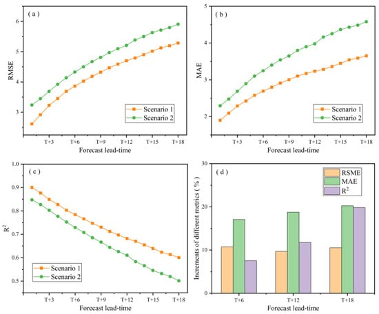 LSTM-attention models were further explored at a time lag of 30 in order to assess the influence of environmental conditions and anthropogenic activities on the predictive accuracy of the model in different forecast lead-times. During these processes, two scenarios were introduced: Scenario 1 constructed a prediction model with water quality, environmental factors and human variable data as multi-source inputs for WQI prediction, while Scenario 2 developed a prediction model that only used water quality data as the input for WQI prediction. It was evidenced that taking environmental conditions and anthropogenic activity into account, Scenario 1 yielded a comparatively better performance for water quality prediction, with a higher R2 value as well as lower RMSE and MAE values (Figure 8a–c). To present the comparison results more straightforwardly, the increments of the RMSE, MAE and R2 were calculated (Figure 8d). It was found that the R2 increased by 7.55%, 11.76% and 19.83% for T + 6, T + 12 and T + 18 cases, respectively, with RMSE values of 10.74%, 9.68% and 10.52%, as well as MAE values of 17.06%, 18.76% and 20.27%, respectively. Therefore, it can be concluded that it would be of great significance to incorporate environmental conditions and human activity covariates into the prediction model for accurate prediction of water quality.