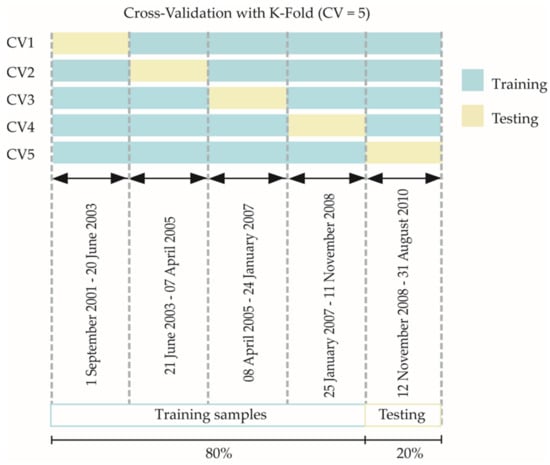• Approach 3: with limited data samples, k-fold cross-validation is the most widely used method to assess the model’s performance. It divides the dataset in k equal-sized numbers, with one out of k parts is used as the testing set while the model is trained using k-1 folds [43]. The configuration of the cross-validation parameter is referred as the number of split iterations that the dataset will be divided into. Overall, it is from 2 to 10 depending on the availability of the data. In this study, we tested the different values of cross-validation (CV). The appropriate value is CV = 5 with 80% as the training set (7 years), along with 20% of the train data as the validation set and 20% for testing (2 years) in each group that was employed (Figure 5).