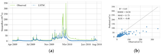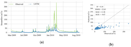 Figure 8. The hydrograph of observed and predicted daily streamflow of LSTM scenario during the testing (a) using approach 2 at TS = 25 along with the corresponding scatter plot (b).