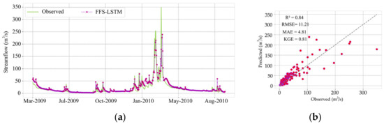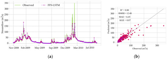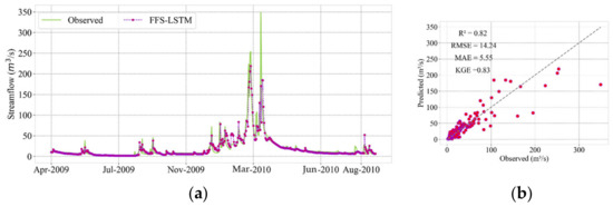 Figure 11. The hydrograph of observed and predicted daily streamflow of FFS-LSTM scenario during the testing (a) using approach 3 (CV = 5) at TS = 10 with the corresponding scatter plot (b).