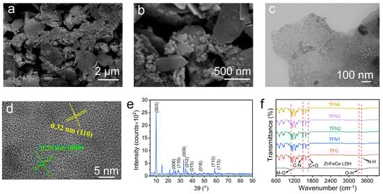 Scanning electron microscope (SEM) images (a,b) and high-resolution transmission electron microscopy HRTEM images (c,d) of the ZnFeCe LDH; X-ray powder diffraction (XRD) spectrum of ZnFeCe LDH (e); Fourier-transform infrared (FTIR) analysis of ZnFeCe LDH, TFC, and TFN membranes (f).
