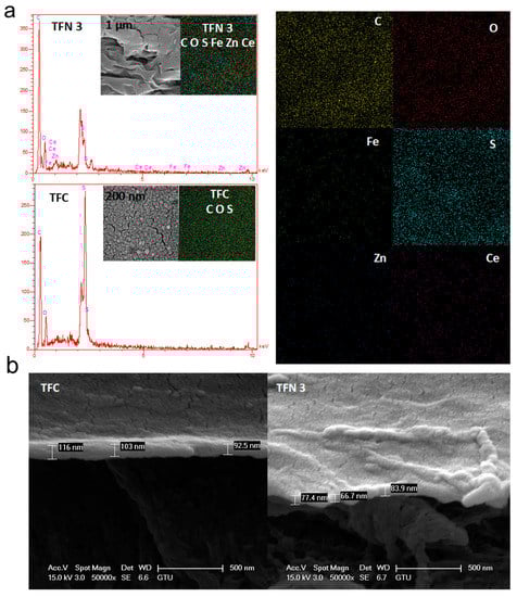 EDS mapping (a) and cross-section images (b) of TFC and TFN 3 membranes.