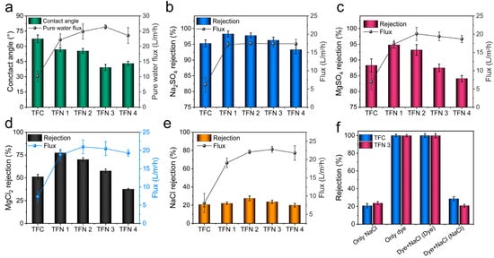 Water contact angle and pure water flux measurements of the fabricated membrane (a); Flux and rejection of the fabricated membranes for different salts, Na2SO4 (b), MgSO4 (c) MgCl2 (d), and NaCl (e); Dye/salt separation performances of TFC and TFN 3 membranes (f).