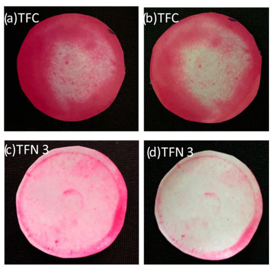 The self-cleaning properties of TFC and TFN 3 membranes were evaluated after filtrating a dye solution. For this purpose, membranes were operated with a 1000 mg/L dye solution until a decrease in the flux was observed due to the coverage of the membrane surfaces with dye molecules. The images of TFC and TFN membranes after 15 min photocatalytic degradation under visible light were illustrated in Figure 5. TFN 3 membrane demonstrated low fouling and high self-cleaning ability due to the presence of ZnFeCe LDH in the membrane surface, while the TFC membrane had limited self-cleaning ability under visible light [43].