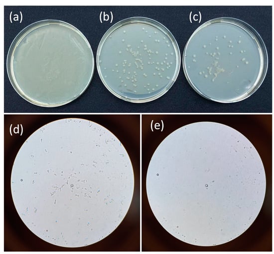 Plate samples of formed E. coli cells (a) without the addition of LDH (b) E. coli + DMAC + 250 mg/L LDH, and (c) E. coli + DMAC + 500 mg/L LDH, E. coli colonies grown on TFC (d) and TFN 3 membranes (e).